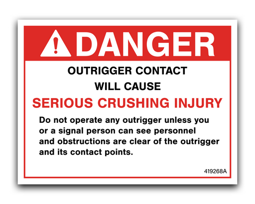 Fast Safety Decalsfrom as low as $1.39DANGER - OUTRIGGER CONTACT WILL CAUSE SERIOUS CRUSHING INJURY Premium vinyl laminated decals to protect from fading. Easy installation: remove lin...