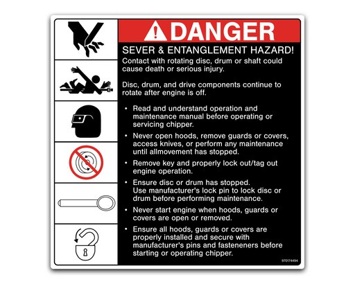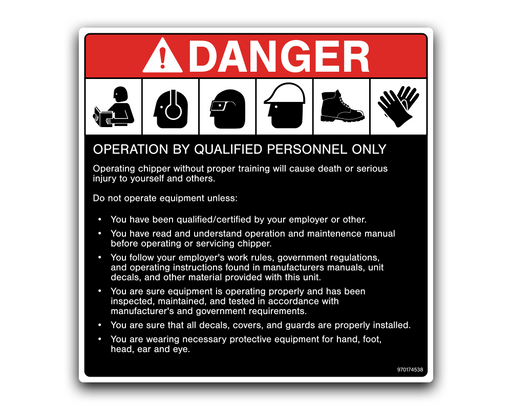 Fast Safety Decalsfrom as low as $5.13DANGER - OPERATION BY QUALIFIED PERSONNEL ONLY. Operating chipper without proper training will cause death or serious injury to yourself and others...