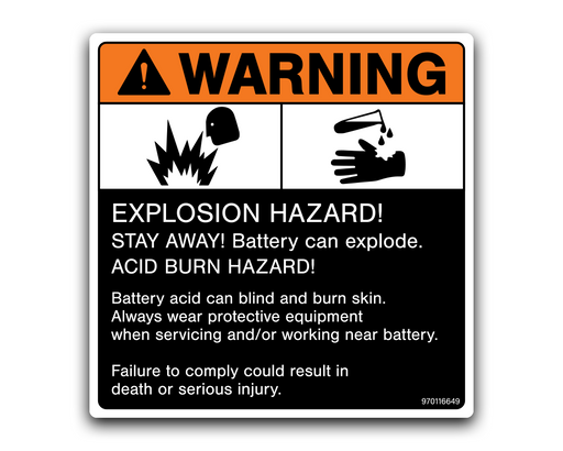 Fast Safety Decalsfrom as low as $2.69WARNING - EXPLOSION HAZARD! STAY AWAY! Battery can explode. Premium vinyl laminated decals to protect from fading. Easy installation: remove liner...