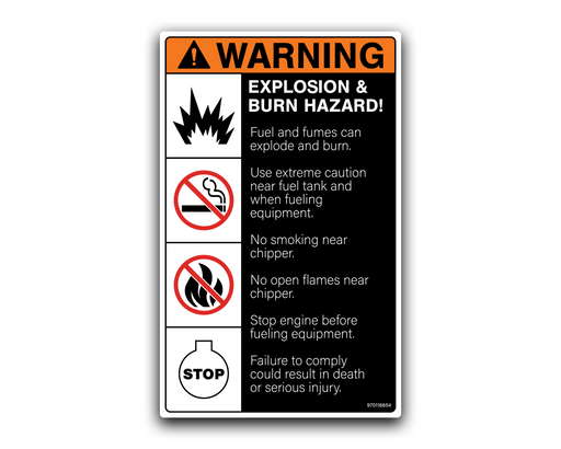 Fast Safety Decalsfrom as low as $4.00WARNING - EXPLOSION & BURN HAZARD! This decal is for a wood chipper. Premium vinyl laminated decals to protect from fading. Easy installation:...